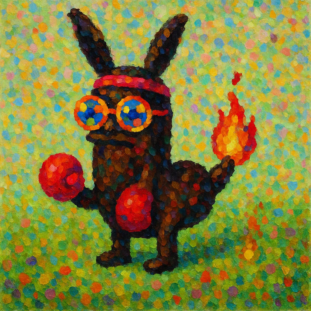 A vibrant collection featuring playful, whimsical characters rendered in an abstract painted dots art style. Celebrating dynamic compositions, bold colors, and textured painterly effects that bring a lively, artistic reinterpretation to the original playful motifs.
