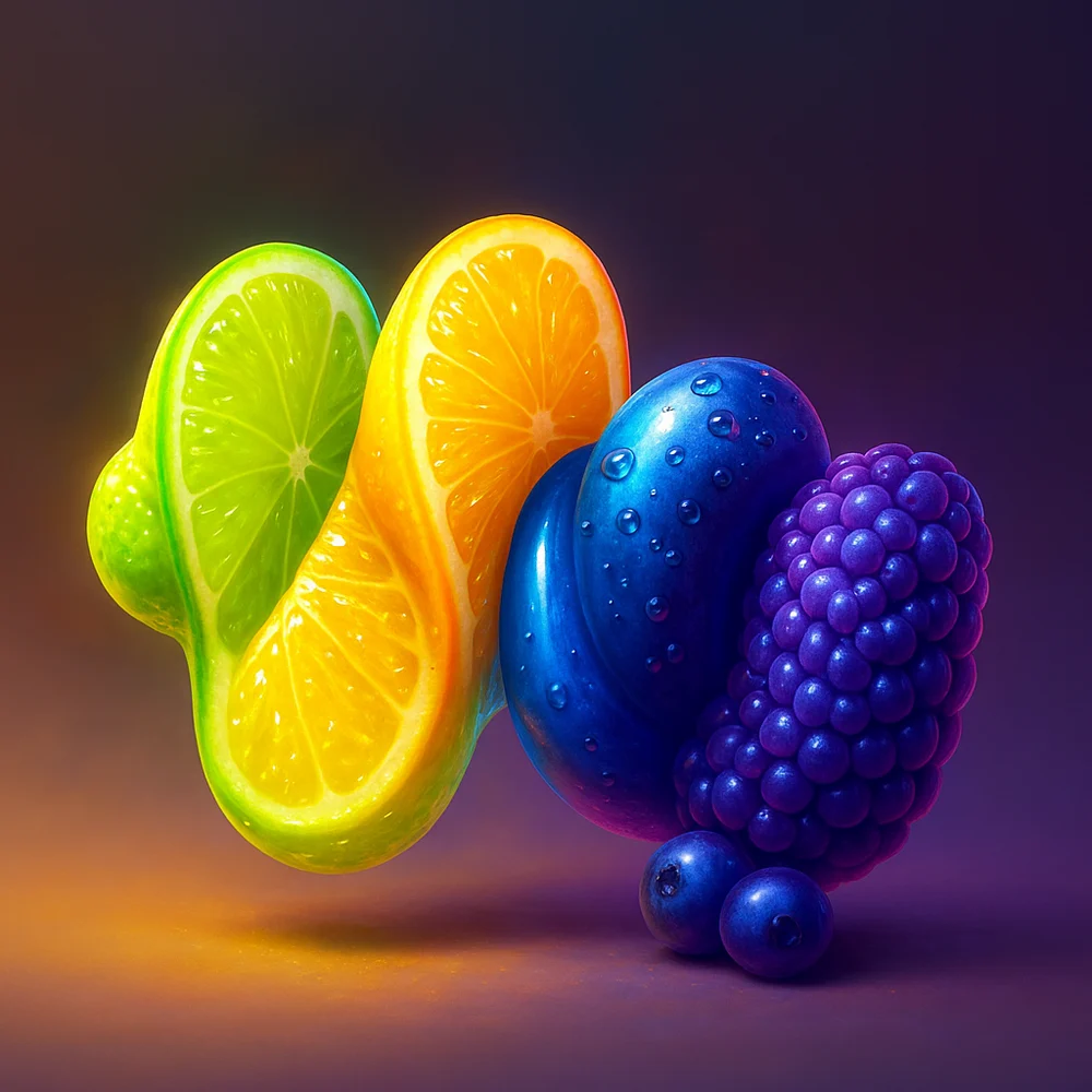An otherworldly creature morphs into a vivid edible form, its fluid squiggle anatomy reimagined as citrus wedges and berries. Surreal, glossy textures, and luminous details converge in a centered, poster-ready composition with depth and an ethereal glow. Neon jewel tones clash and harmonize, creating a tactile, studio-grade piece that invites close inspection and playful appetite.